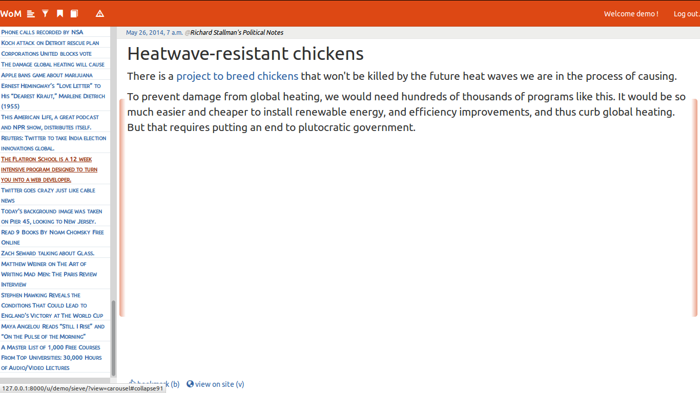 This project intends to provide a free (as in freedom) alternative to web news readers and bookmarking apps.