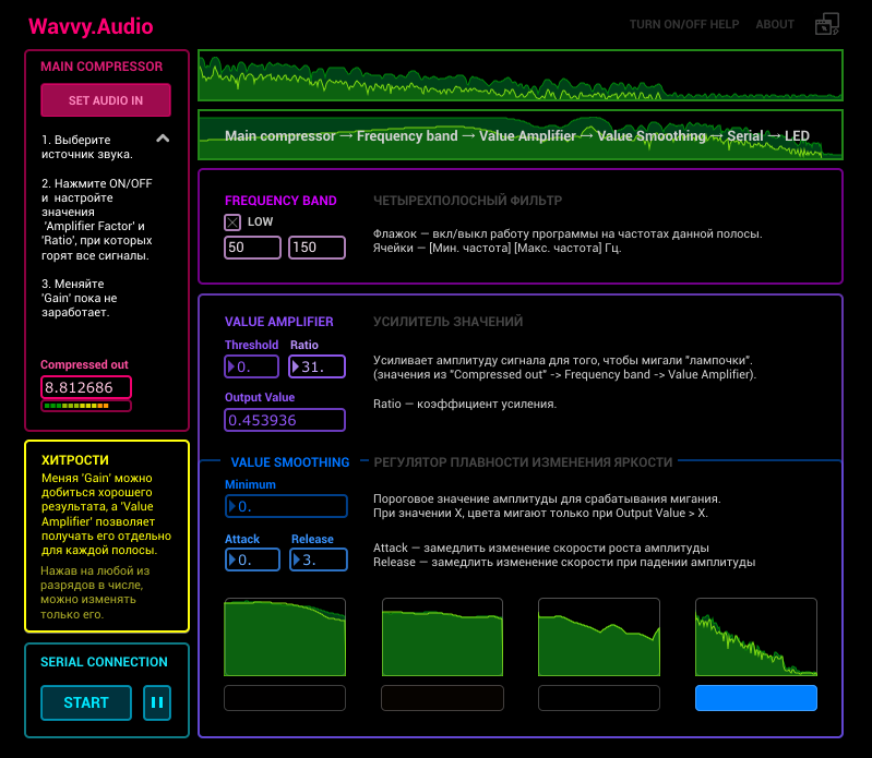Написана на Max MSP для связи с Arduino по Serial порту. Программа посылает значения яркости от 4 до 255, с добавленными к ним идентификаторами частотных полос 0, 1, 2, 3.