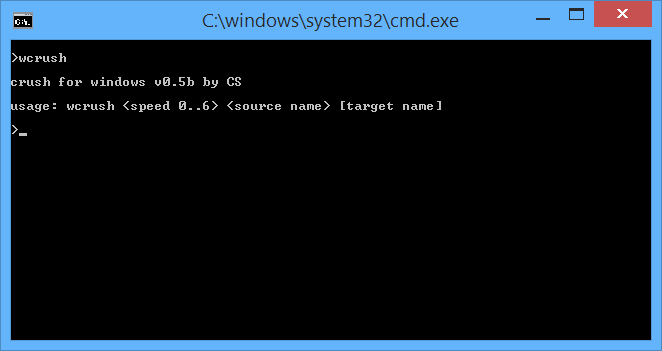 wcrush aka Crush for Windows was developed as a replacement for Taboo's crush.exe levelpacker, a cross platform tool allowing the use of faster PCs to compress Commodore 64 executables, which unfortunately doesn't work on modern Windows incarnations as e.g. Win8.1 64 bit due to its age.