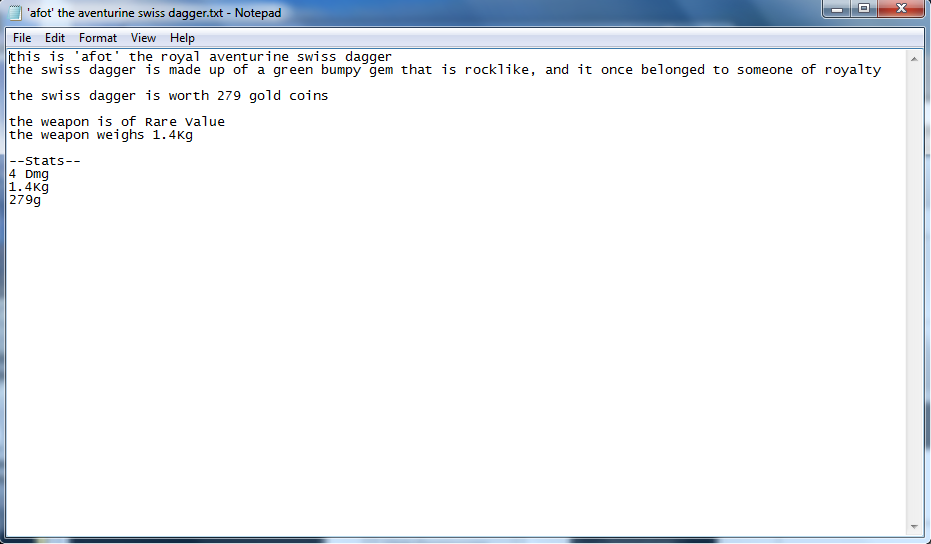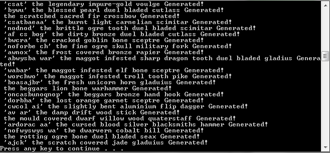 This Program generates random weapons, you simply enter how many weapons you want generated and in no time you have a big enough arsenal to fill 100 fantasy worlds.