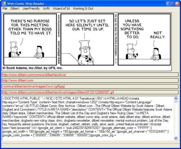 WebComicReader is a Web Comic Reader written in C#. It is used to read Dilbert, User Friendly, Wizard of ID, Unfit, Working It Out ... It has open architecture and can be updated to read any Web Comic, by simply adding the links and regular expressions.