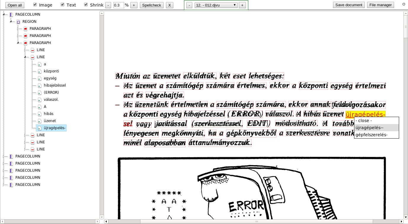 WebDjVuTextEd allows to edit the text layer of OCR'ed DjVu documents in a web browser. You can modify the structure (paragraphs, lines, words...) create, delete, edit text nodes, modify their container box by mouse, and run a spellchecker. The program does not directly read the DjVu files, it requires exported XML text data and images. When using without a webserver, you can open and save local files, but cannot take advantages of auto-save and spell checking.