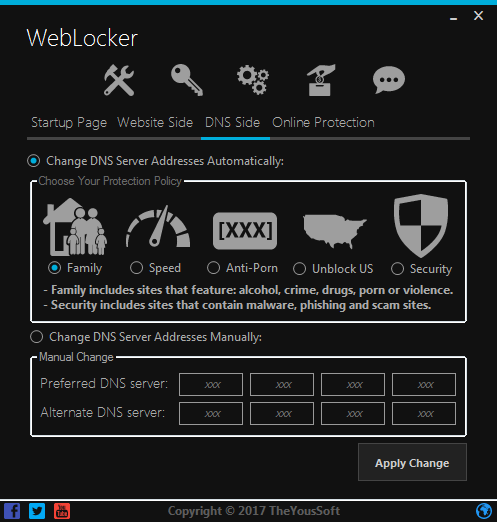 WebLocker is a free software that allows you to block annoying ads, block domains known to spread malware, block adult websites (Pornography), block social networks, block online gambling, stop DNS leaking and more features. Available for Windows: XP, 7, 8, 8.1 and 10.