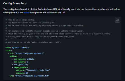 This tool checks all the websites listed in its config. When a change is detected, the new site is added to a git commit. It can then be inspected via normal git tooling. The config describes a list of sites. Each site has a URL. Additionally, each site can have editors which are used before saving the file. Each editor manipulates the content of the URL.