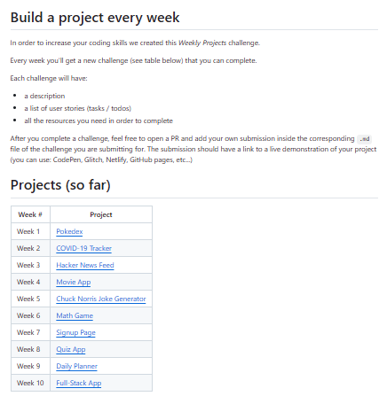 weekly-projects aims to motivate developers by issuing a fresh project challenge every week. The idea is to build something new each week, thereby improving coding discipline, exploring new tools and stacks, and steadily growing capability. Each weekly challenge includes a description, a set of user stories (tasks), and the necessary resources. After finishing, contributors can open a pull request with their own solution and demo link, so this becomes both a learning tool and a showcase platform. It’s great for those who want paced practice rather than open-ended ideas. The challenge list includes things like a Pokédex app, COVID tracker, movie app, quiz, daily planner, full-stack app, etc. The curated weekly cadence helps maintain consistency and momentum. And although lightweight, the public nature of submissions gives social accountability and visibility.