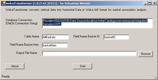 This tool acts as a preprocessor and transforms data from a database into arff format for weka data mining. Vertical to horizontal transformation for association analysis. The tool can use databases for which an OleDB adapter exists. Vb.Net for Win32