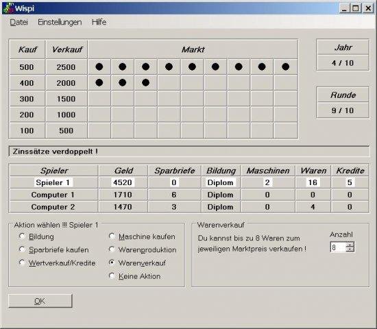 Wispi (WIrtschafts-SPIel) is a German only economy simulation game for one to ten players which can be human or computer players. Goal is to earn most money as an employee or a fabricant in a given time. Needs MS .NET 2.0 runtime library.