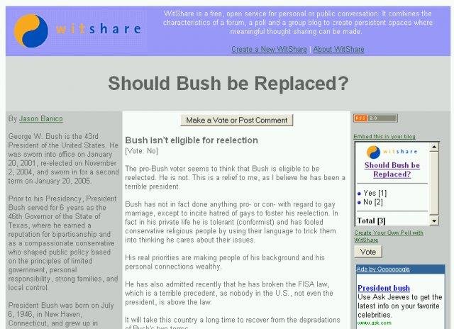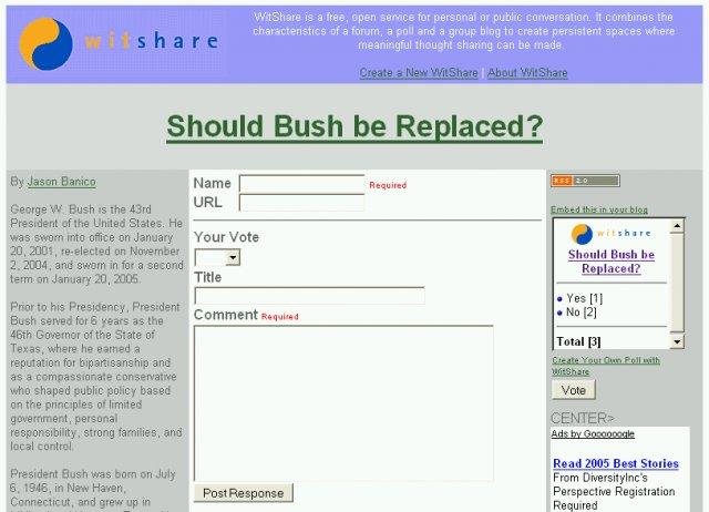 WitShare is a free, open service for personal or public conversation. It combines the characteristics of a forum, a poll and a group blog to create persistent spaces where meaningful thought sharing can be made.