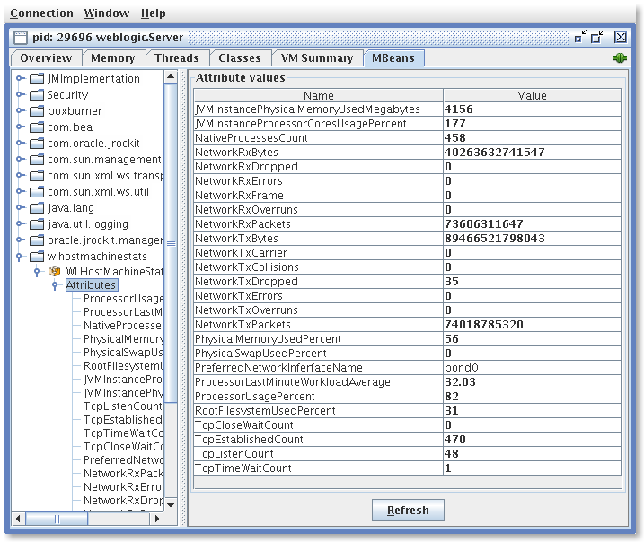 WLHostMachineStats is a small agent (JMX MBean) that runs in every WebLogic Server in a WebLogic domain. It is used to collect statistics (O.S. CPU/Memory/Network usage) from the machine hosting each WebLogic Server instance. Also see DomainHealth.