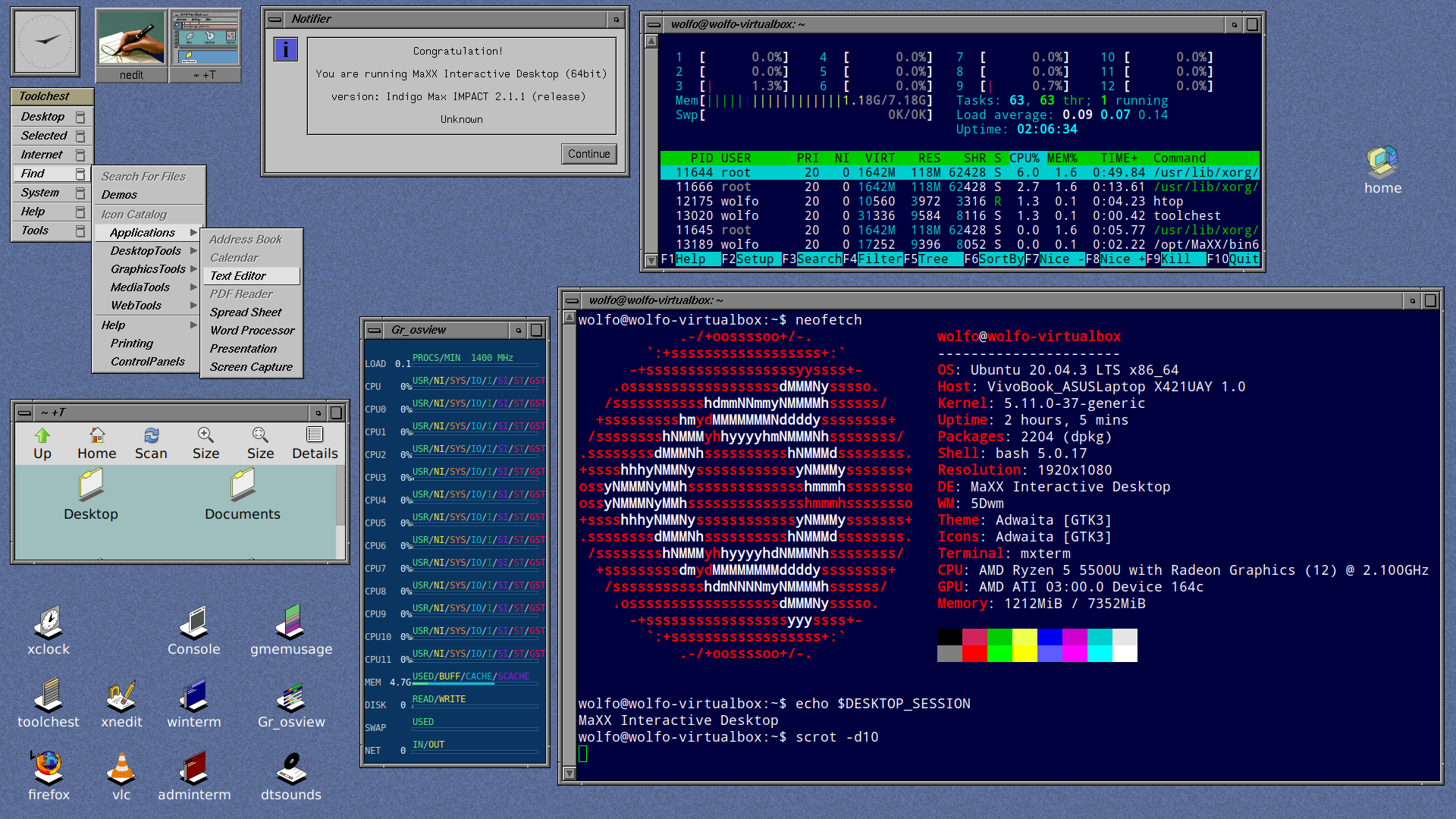 A Debian/Devuan/Sparkylinux/Star Linux/Ubuntu (based maybe ?) Operting Systems with variety of mainstream or antique types of desktop environments and window managers.