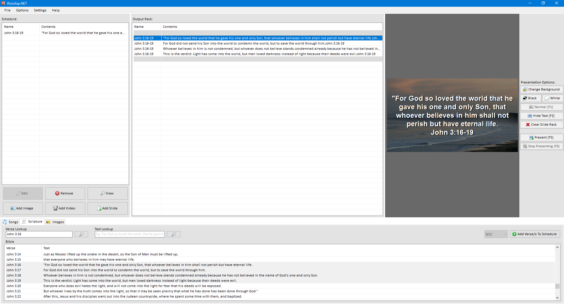 Worship.NET is a free, basic, open-source church presentation program, with features such as lyric projection, scripture lookup and much more!