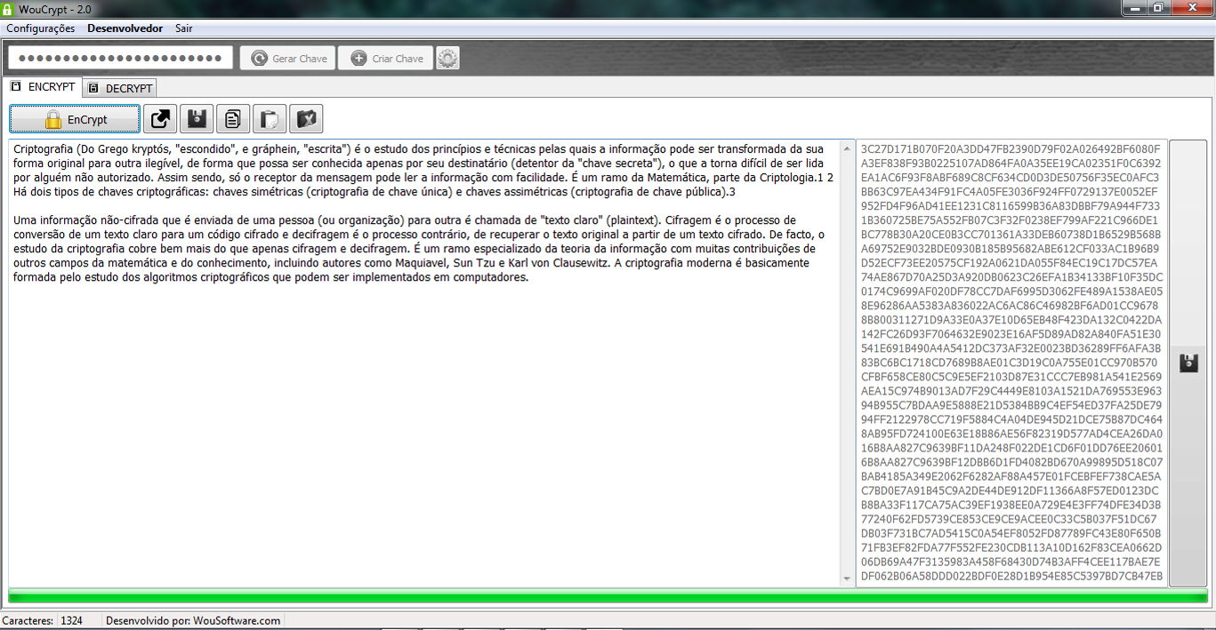 WouCrypt é uma aplicação para criptografia de texto. O app permite criar uma chave de segurança digitada pelo próprio usuário ou gerada aleatoriamente pelo programa. Com isso, isso gerado, você pode digitar mensagens para serem criptografadas ou descriptografar qualquer texto ou arquivo que tenha sido produzido a partir do mesmo código.