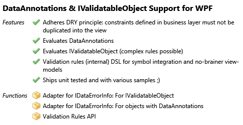 This project fills this gap via adapters to the IDataErrorInfo interface which is supported by the WPF validation infrastructure.