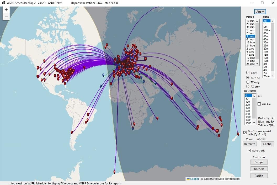 3) WSPR Map - displays the reported transmissions on a World map to show the location of WSPR reports,