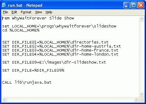 A simple, easy to extend, parameter driven and customisable Java application that displays JPEG images. An advanced end-user is required to install and amend parameters and create the file that contains the list of folders that contain the images.