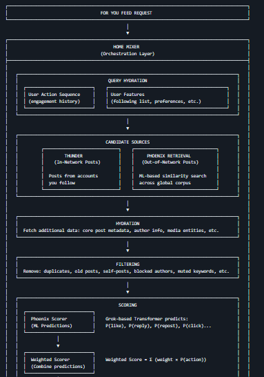 X For You Feed Algorithm is the open-sourced core recommendation system that powers the For You feed on X (the social network formerly known as Twitter), and it represents one of the first times a major social platform has published production-level ranking code for public review and experimentation. The repository contains the full pipeline that ingests user engagement and content candidate data, processes it through retrieval, hydration, filtering, scoring, and selection layers, and ultimately ranks posts to show what appears in a user’s feed. At its heart, the system uses a transformer-based model adapted from xAI’s Grok architecture to predict probabilities for various user actions (such as likes, replies, reposts, clicks, and negative signals), then combines those into a weighted final score that drives ranking.