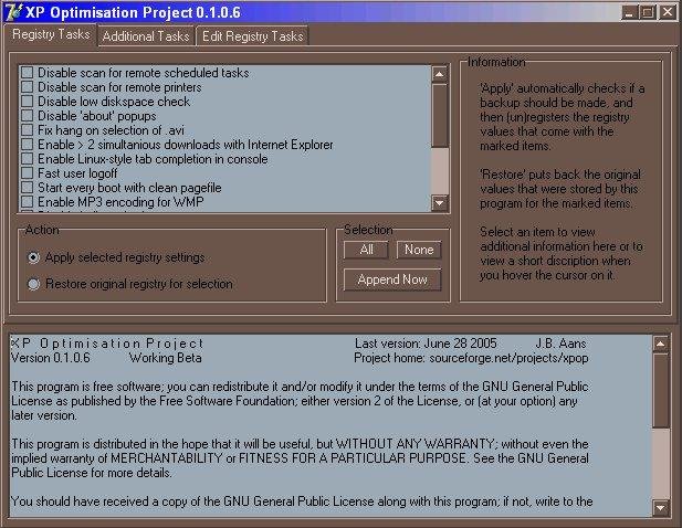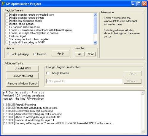 XP Optimisation Project allows the user to quickly change and optimise a fast number of deep-system settings, including registry settings and system locations like Program Files, using a single settings file and a few clicks. Current Status PRERELEAS
