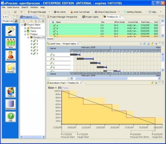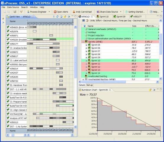 xProcess, for project management and process improvement, focuses particularly on agile and priority-driven approaches. The preconfigured processes, eg. Scrum, FDD, Prince2, Unified, can be tailored. Gantt/Burndowns/target status are continually updated.