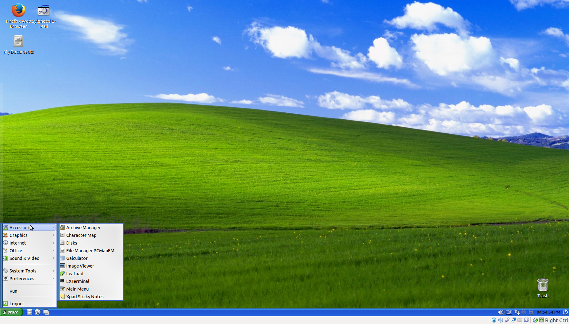 A base installation of Lubuntu 14.04, with all updates/patches, themes, and visual tweaks to make it look as much like WinXP as possible, including: