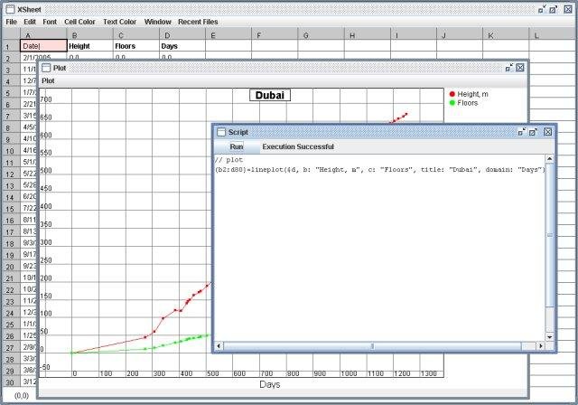 XSheet is a spreadsheet program with many of the basic spreadsheet features like function plotting, sorting, searching, import/export, formulas and runnable scripts.