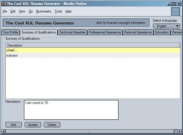 The Cool XUL Resume Generator is a web based application for creating and maintaining professional resumes, using mozilla's XUL for a simple to use GUI interface, and php/mysql to manipulate the resume data and generate the final resume document.