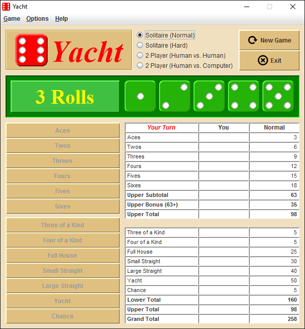 Yacht is a dice game based on poker dice, and very similar to another well known dice game available at most stores that sell games and toys.