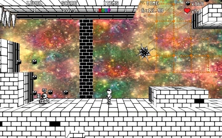 Y.A.G.A.C. is a very challenging and addictive pseudo-2D platformer game, with 2D sprites in a 3D playfield, but you are limited to movement in two dimensions. It's a story-less game, heavily gameplay based, where you play a ninja trapped in dungeons filled with traps and robots. As you collect colored balls hidden around the level, so the platforms of that color become solid and you can then reach new places inside the level. A very challenging game. Excellent and very smooth engine, the game's strongest point.
