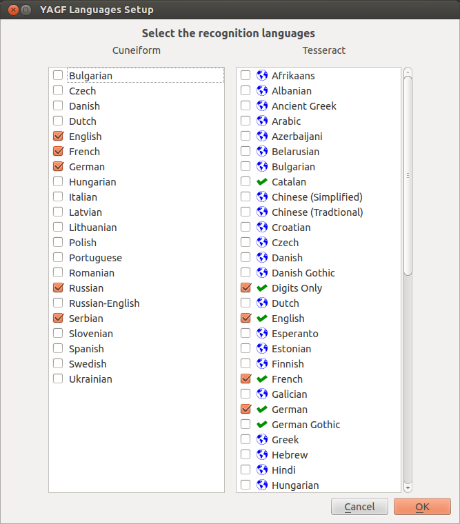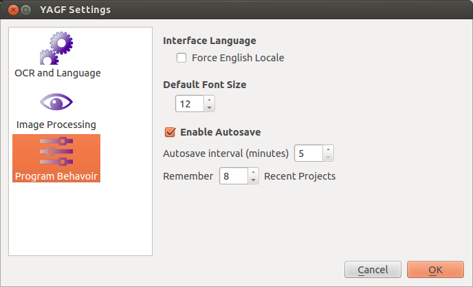 YAGF is a graphical front-end for cuneiform and tesseract OCR tools. With YAGF you can open already scanned image files or obtain new images via XSane (scanning results are automatically passed to YAGF). Once you have a scanned image you can prepare it for recognition, select particular image areas for recognition, set the recognition language and so on. Recognized text is displayed in a editor window where it can be corrected, saved to disk or copied to clipboard. YAGF also provides some facilities for a multi-page recognition (see the online help for more details).