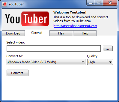 YouTuber is an opensource tool created in vb.net 2010 for Windows to download, convert and play videos from YouTube.