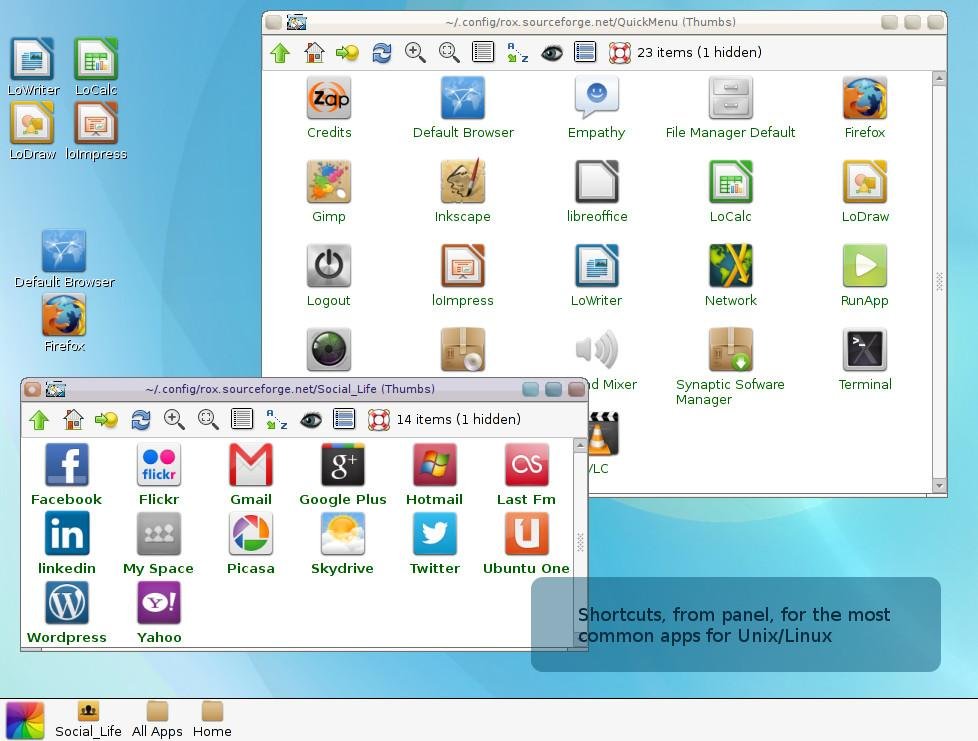 A simple "my own" Desktop for Linux ( designed by vertigini.com.br, not a WM ) with a strong focus on social networks and Cloud Computer users , based on Fluxbox and ROX . For now, we have packages for Debian , Ubuntu and compatible, but with the code , all written in zenity , shell script , it is very easy to port it to any Linux distribution . The goal is to provide an environment that is a very lightweight option for consecrated Unity , Gnome , KDE or XFCE and LXDE and has excellent usability .