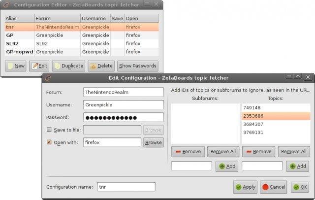 Fetches topics with new posts from ZetaBoards forums and does something with the URLs, like opening them in a browser. Configurations can be stored and manipulated for quicker fetching.