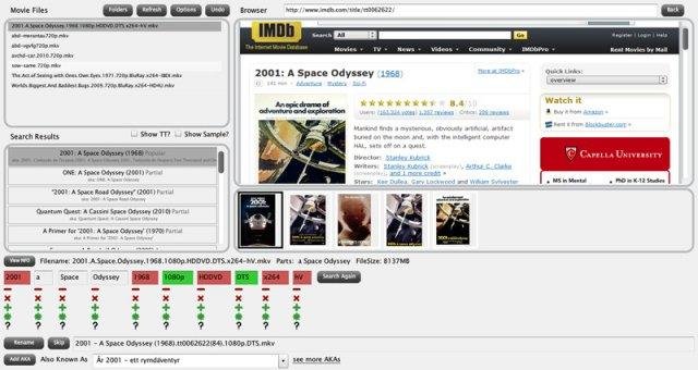 Adobe AIR app (Windows OSX Linux) for renaming movie files & DVD folders, downloading posters, and creating .url shortcut links to IMDB. Uses NFO file when available. Remembers words to save (720p, DTS) and remove (like release group names).