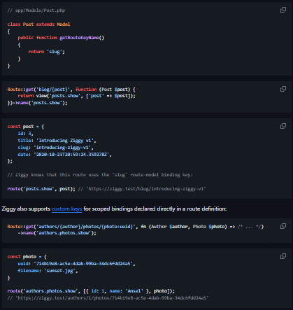 Ziggy provides a JavaScript route() function that works like Laravel's, making it a breeze to use your named Laravel routes in JavaScript. Ziggy supports Laravel's route-model binding, and can even recognize custom route key names. If you pass route() a JavaScript object as a route parameter, Ziggy will use the registered route-model binding keys for that route to find the correct parameter value inside the object. If no route-model binding keys are explicitly registered for a parameter, Ziggy will use the object's id key.