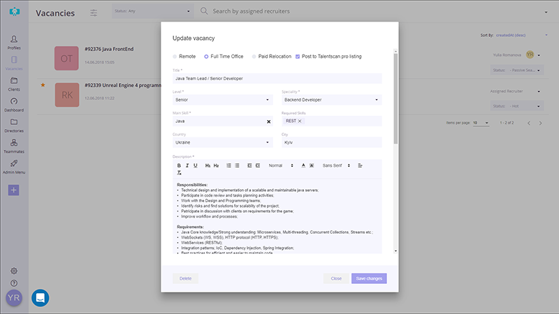 Simultaneous cross-search multiple job search sites, social networking for professionals and relevant communities, as well as a private candidate database with automatic merging of contacts and alternative e-mail for each candidate. Tools of Automation and systematization the process of attracting and searching candidates for a vacancy. Gathering information about the candidates (CV and other documents of correspondence). Collection of statistics of interaction with potential candidates. Planning an interview. In the card of the candidate, you can immediately see when and which candidate was showed to the client. Recording and storage of history of interaction with candidates and clients. Maintenance the recruitment and collection of statistics at every stage of interaction. Automatically updated statuses, ratings of technical skills in cards of candidates will tell you the vector of development of each of them.