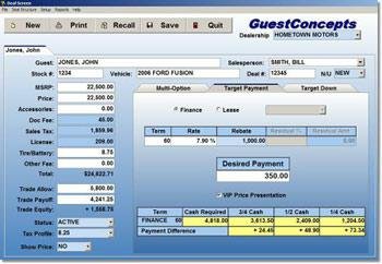 Guest Concepts provides a fresh approach to selling cars and presenting numbers. We help you teach your Salespeople not to ask the questions that will ultimately undermine the sale at the negotiation stage. The Guest Concepts software helps you instantly create a Customer-Friendly presentation that helps you get off of price and onto Payment and Down Payment which are the motivating factors in most Car buying decisions. Finally the presentation helps the Salesperson explain the relationship between Payment and Down Payment and helps the Salesperson get additional Down Payment because of a simple stair-stepped approach. Putting this presentation in the hands of the Salesperson has a huge impact on their confidence. The Guest Concepts approach will help you Sell the Customer the first time.