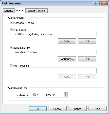 Welcome to Active To-Do List. Active To-Do List keeps track of your tasks in an easy to use format. Quickly record as many notes as you need for each task, and organize your tasks into categories or even different to-do lists. Tasks can be set to repeat at a wide variety of intervals so repeating tasks only need to be entered once. Remind yourself with a variety of alarm options including a popup window, playing a sound, sending an email reminder, or running any program. Your to-do list can be published to your web site with the push of a button, so you can view it even while you're away from your computer. Active To-Do List is very simple to learn and use, but also offers advanced filtering and searching capabilities when needed. Create as many to-do lists as you need. You may want to organize your tasks into different to-do lists. Each person in your family could have their own to-do list, or you could have one for work, and one for home.