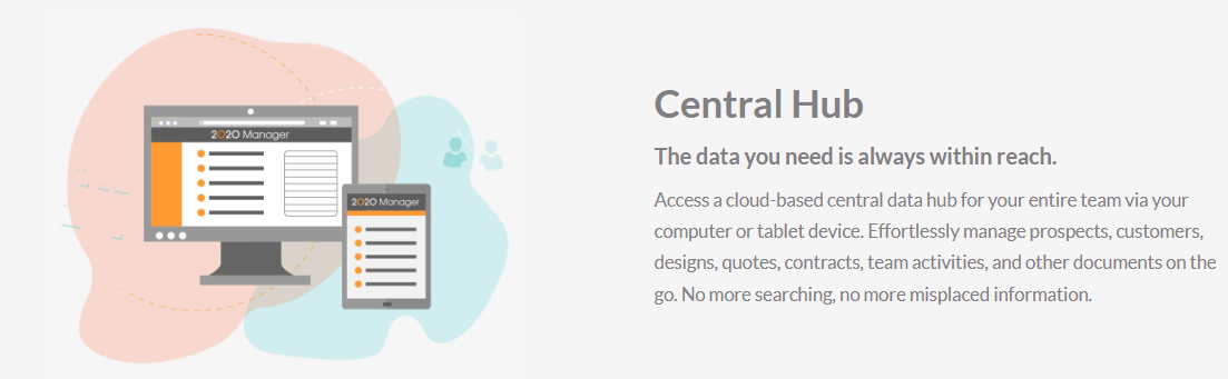 Access a cloud-based central data hub for your entire team via your computer or tablet device. Effortlessly manage prospects, customers, designs, quotes, contracts, team activities, and other documents on the go. No more searching, no more misplaced information. Oversee and organize employee tasks, goals, responsibilities, performance, and activities. Offer centralized workflow dashboards for your team members. Keep your business on track, employees on task, and your calendar synced with superior business process management tools. Meet your individual business needs with a predefined but configurable solution to guide your team throughout the customer journey, from prospect to contract. Access and manage surveys, quotes, and reports to gain automated insight into consumer behavior and needs.