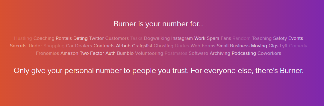 Burner is the original second phone number app for calling, texting and picture messaging. Stay safe and anonymous when you give out your number. We reroute calls coming to your Burner temporary phone number and send them to your cell phone so your personal number stays private. Create as many simultaneous local numbers as you need, in any U.S. or Canadian area code. Calls and texts work similarly to how they do on your main cell phone number but route through your fake phone number. Keep numbers as long as you want, and burn them whenever you like. Grab as many Burner numbers as you want! We've got two options when it comes to new lines. Prepaid Burners are temporary phone numbers, great for salespeople, dating or Craigslist. They're available to purchase in the Burner iOS and Android apps. Download the app to get a free temporary phone number for a week. Subscription Burners are perfect for a long-term second phone number for work or personal use.