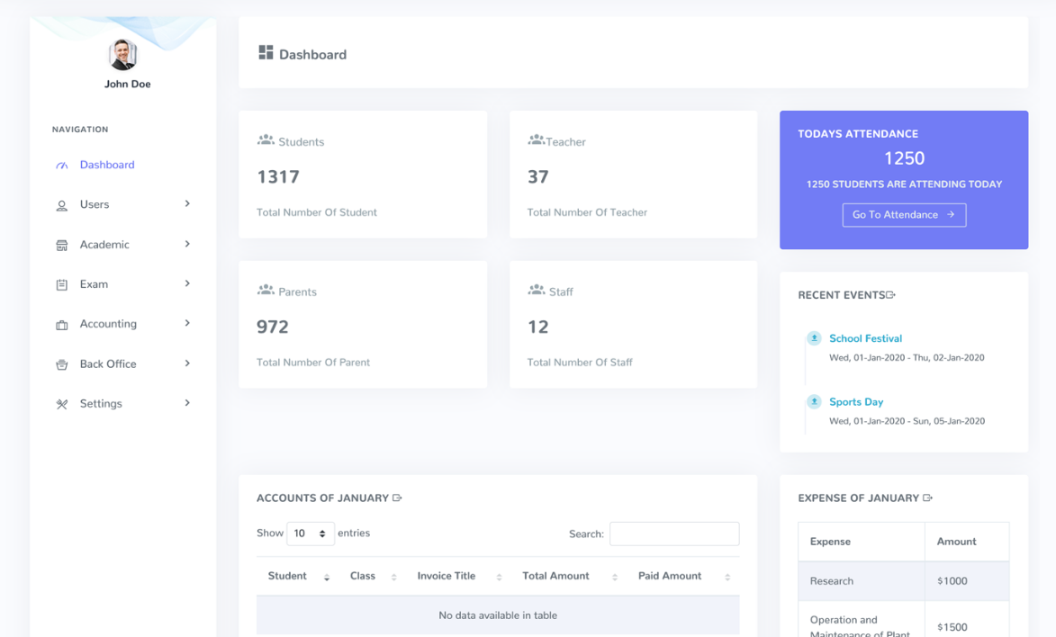 360 School Management System is the best school echo system that combines teacher, student, parent and other school staffs in a single automation software. The system was built to provide all important features you would require to run your school. We built the 360 SchoolManagement System with an addon system and api for mobile apps, which can be extended to unlimited features. Setup your school according to your preferences. Create new Classes and Classrooms. Manage couple of essentials Academic Scool Area like creating a departments, adding teachers and adding syllabus. 360 Logix SchoolManagement System admission process automates the various steps involved in admission of students. 360 School Management System provides Admins and Teachers a convenient way to track the attendance of students.