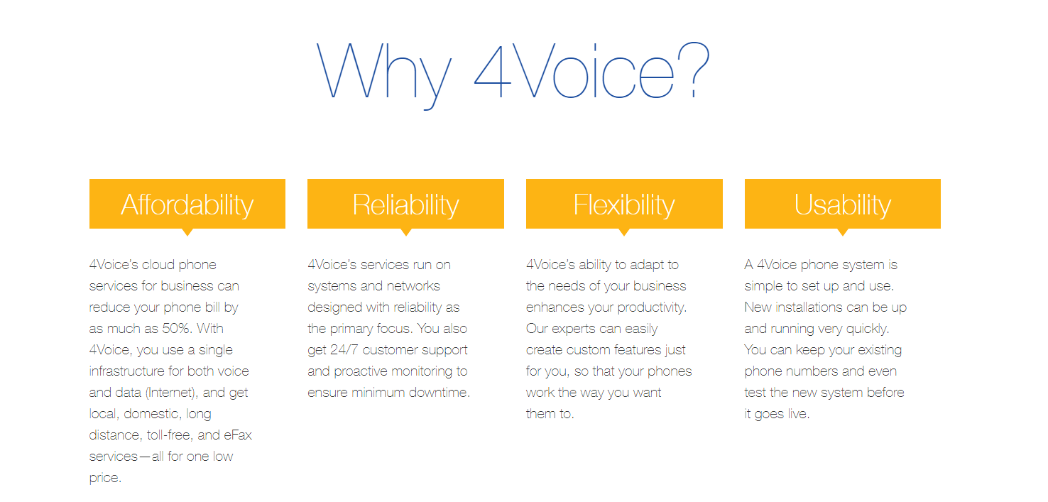 4Voice’s telecom experts analyze all facets of your voice communication needs to deliver a customized solution that fits the budget, bandwidth and priorities of your business. White glove service and one-on-one training ensure zero down-time and painless deployment, so your business can focus on the work that really matters. Whether calling from the home office, branches or working remotely, your voice transmissions are managed from a secure location, delivering cloud service that is fast, clear and reliable. 4Voice’s cloud phone services for business can reduce your phone bill by as much as 50%. With 4Voice, you use a single infrastructure for both voice and data (Internet), and get local, domestic, long distance, toll-free, and eFax services—all for one low price.