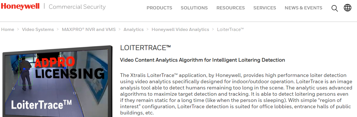 The Xtralis LoiterTrace™ application, by Honeywell, provides high-performance loiter detection using video analytics specifically designed for indoor/outdoor operation. LoiterTrace is an image analysis tool able to detect humans remaining too long in the scene. The analytic uses advanced algorithms to maximize target detection and tracking. It is able to detect loitering persons even if they remain static for a long time (like when the person is sleeping). With a simple “region of interest” configuration, LoiterTrace detection is suited for office lobbies, entrance halls of public buildings, etc. LoiterTrace is now available for server platforms and edge devices. Supporting up to 32 channels on ADPRO® devices and up to 8 channels on HeiTel devices, LoiterTrace complements the powerful recording, transmission, alarm handling and flexible licensing capabilities of these established platforms with high-performance video loitering detection.