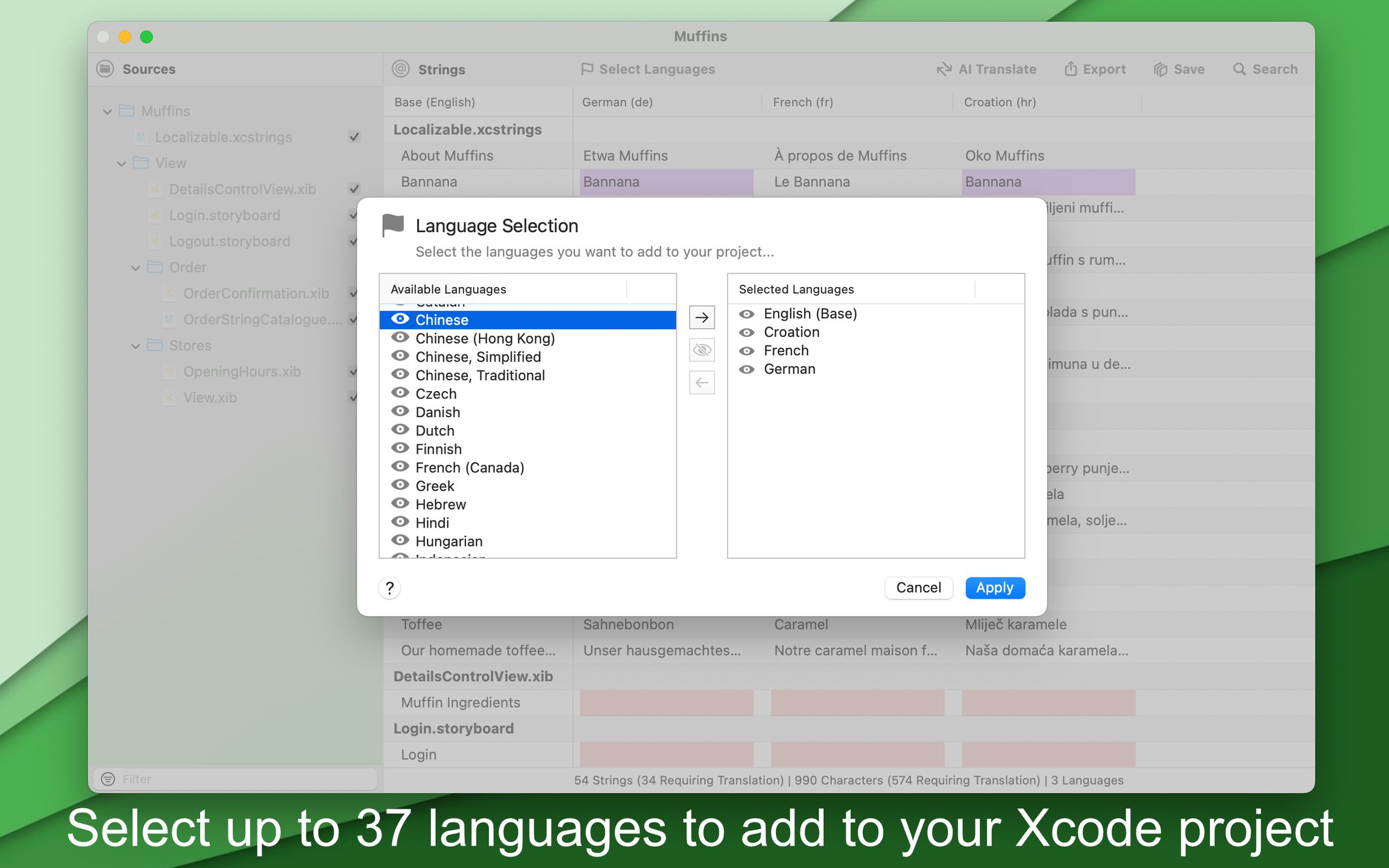 - Localize strings within SwiftUI, Storyboard, or XIB interfaces, offering support for both .strings and .xcstrings catalogue file formats.
