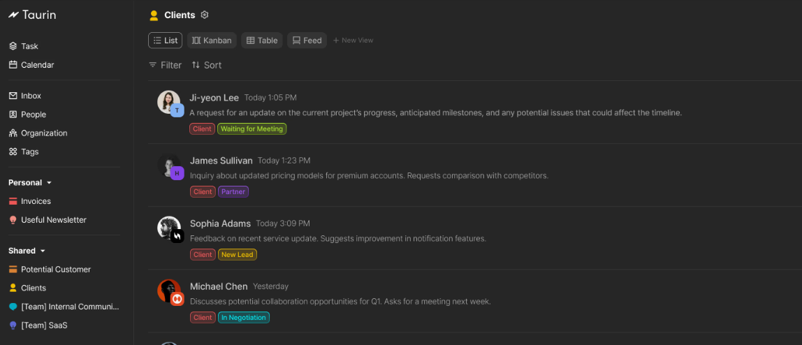 Auto-segmentation, smart filtering, AI auto-complete, and built-in CRM. Stop wasting time on repetitive tasks. Manage contacts with custom properties. Adapt to any scenario, from sales to marketing and recruitment. Simplify your email experience with Taurin. This tool organizes your inbox, provides summaries, and enriches your contact database. With Taurin’s autonomous features, you’ll spend less time managing emails and more time building meaningful connections. Email isn't going anywhere, but how we handle it needs to evolve. With remote work becoming the norm and digital communication exploding, we need smarter tools to manage our interactions. Taurin isn't just another email client, it's your personal email intelligence partner. Smart AI that intelligently organizes your emails. Rich contact insights that give you the full picture. Lightning-fast AI writing assistant with auto-summarize and auto-complete. Built-in CRM to keep all your relationships organized.