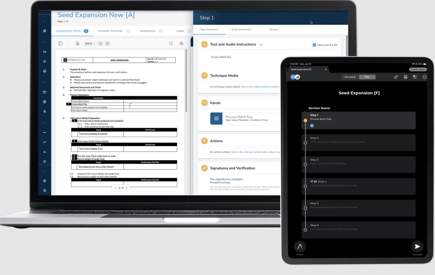 Put power in the hands of your scientists. With intuitive, no-code method authoring designed for scientists, your quality team has full control to develop test methods on their own. Tempo allows users from your organization to author test methods together in real-time with live group-editing collaboration tools. Users can quickly create advanced workflows with sophisticated capabilities like parallel execution, branching, and enforcement logic as well as integrate referenceable parameters, formulas, equipment, materials, and scientist actions, without writing a single line of code. Our native mobile app and hands-free, voice-enabled headset moves with you. Tempo is optimized for use in a lab, is cleanroom compliant and is compatible with PPE. Scientists can follow audio or text instructions enhanced with photo, video, and AR overlay directions that are specific to the equipment and layout in their lab, making each method step crystal-clear.