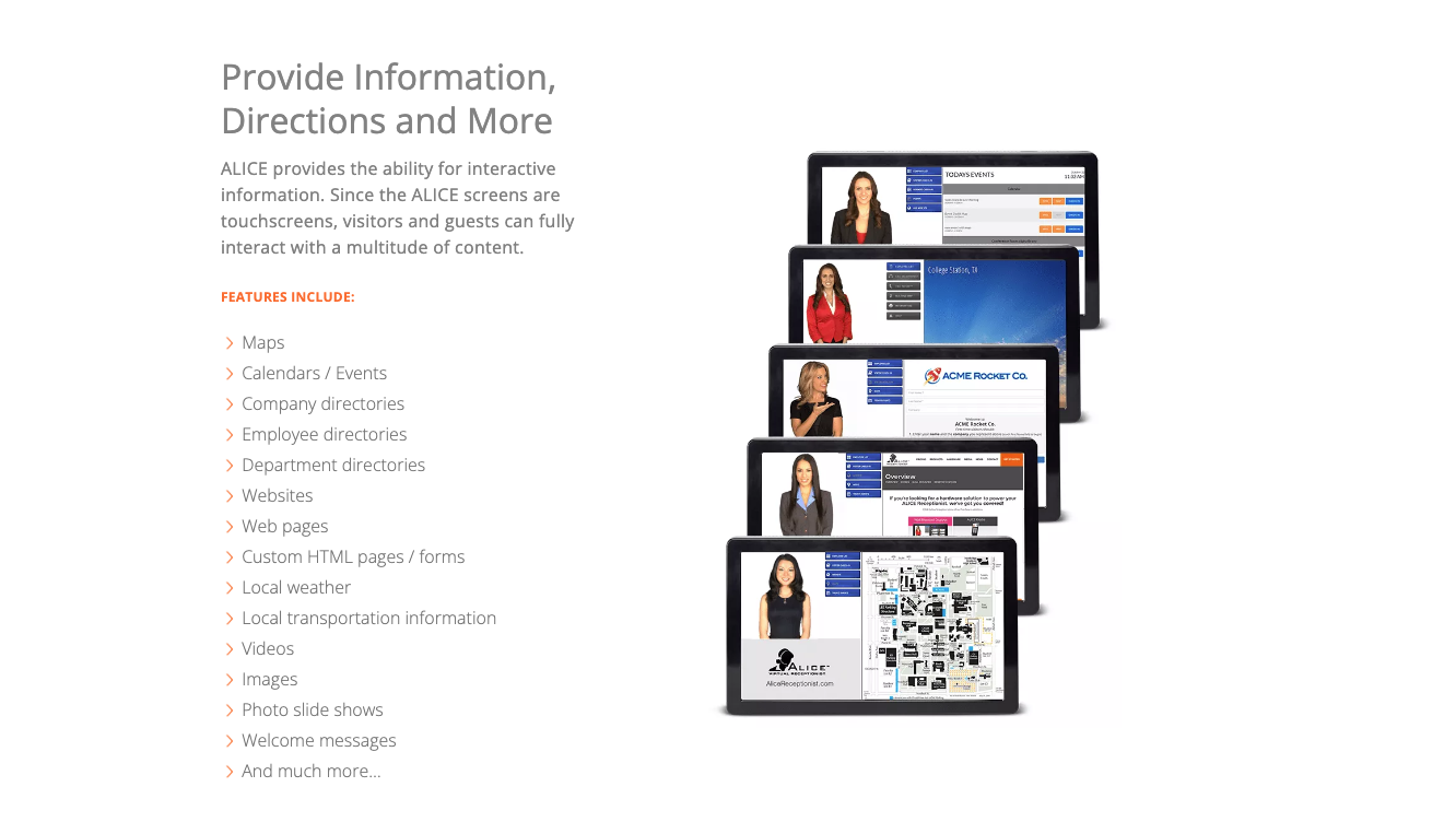 ALICE Receptionist is the most advanced full-service Visitor Management and Lobby automation solution available. ALICE receptionist uses A.I. video avatars to greet guests when they arrive in your building, provide instructions throughout the check-in process and enable guests using the ALICE kiosk to engage with your employees in live 2-way audio and video conversations.