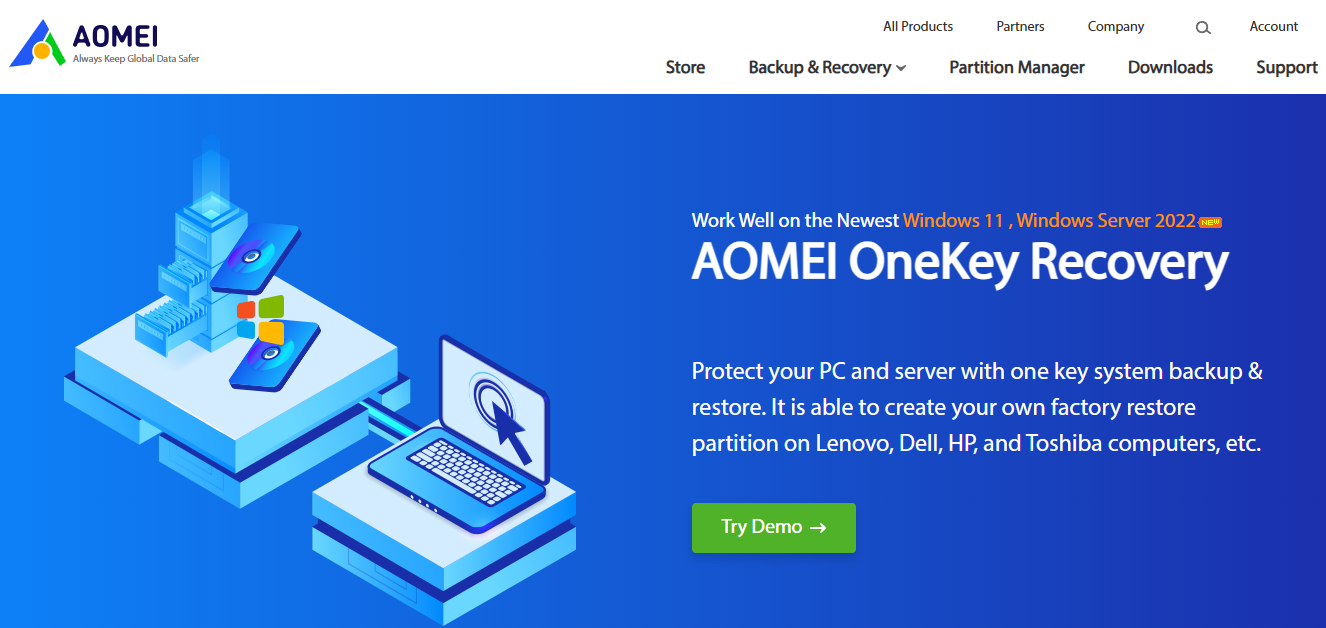 AOMEI OneKey Recovery is a user-friendly system backup and restore software compatible with Windows PCs and servers. It enables users to create a factory recovery partition, allowing for easy restoration of the system to its original state in case of failure. The software supports backing up the operating system to various locations, including internal or external drives and network locations. During startup, users can press the "F11" or "A" key to enter the recovery environment and restore the system. AOMEI OneKey Recovery offers advanced backup options, such as adjustable compression levels to save disk space and password encryption to prevent unauthorized access. It is compatible with multiple Windows operating systems, including Windows 11, 10, 8.1, 8, 7, XP, Vista, and various Windows Server versions. The software supports a wide range of storage devices, including local disks, external hard drives, solid-state drives, and USB flash drives.
