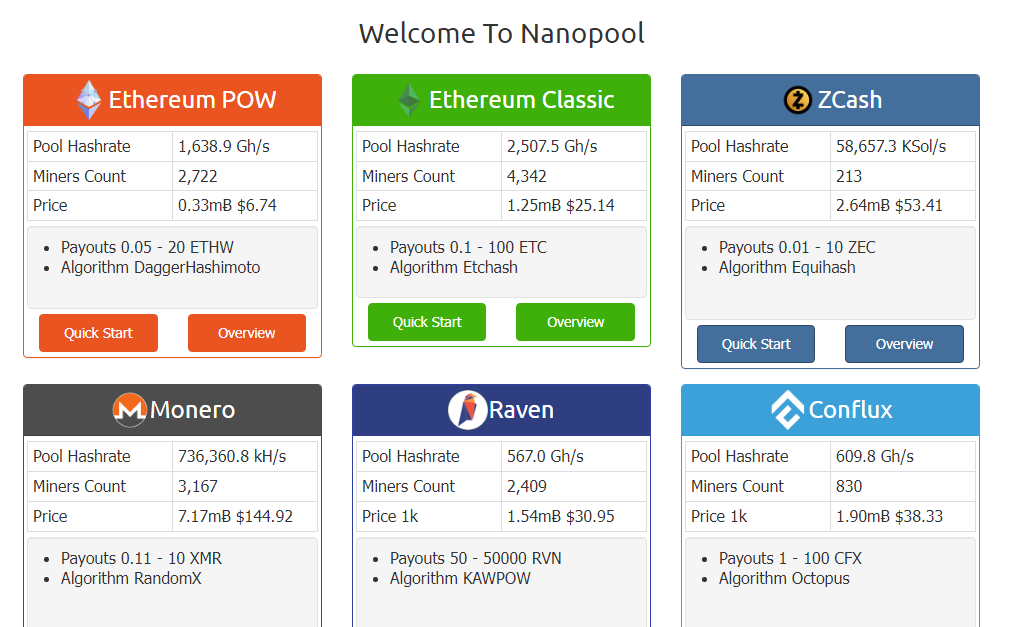 Nanopool is a cryptocurrency mining pool that allows miners to mine for Ethereum, Ethereum Classic, ZCash, Monero, Raven, Conflux, and Ergo. You're encouraged to use Nanominer as it's a fast and stable, user-friendly and reliable multi-algorthm miner which has been released by Nanopool team - one of the best cryptocurrency mining solution available. Nanominer runs on both Windows & Linux OS and supports Nvidia as well as AMD GPUs.