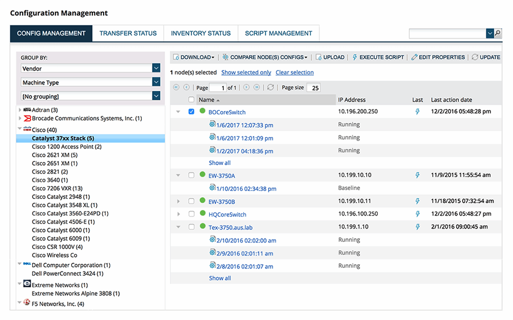 Automate network configuration management and compliance, which can help save time and optimize IT resources. Reduce cost, save work hours, and remain compliant with automated network configuration management and backup. Stop worrying whether inventory spreadsheets and lists are accurate, up-to-date, and reliable. With SolarWinds® Network Configuration Manager (NCM), you can quickly build an accurate inventory of your network devices by using network scanning and discovery to obtain up-to-date information on all network devices. When it comes to network configuration management, it’s critical to quickly and precisely compare configurations for a number of reasons. Some examples could be to check against security policies, to ensure there are no discrepancies between running and saved configs, and to quickly identify and fix unauthorized or failed changes. Automation of network configuration management simplifies processes like scheduling regular backups.