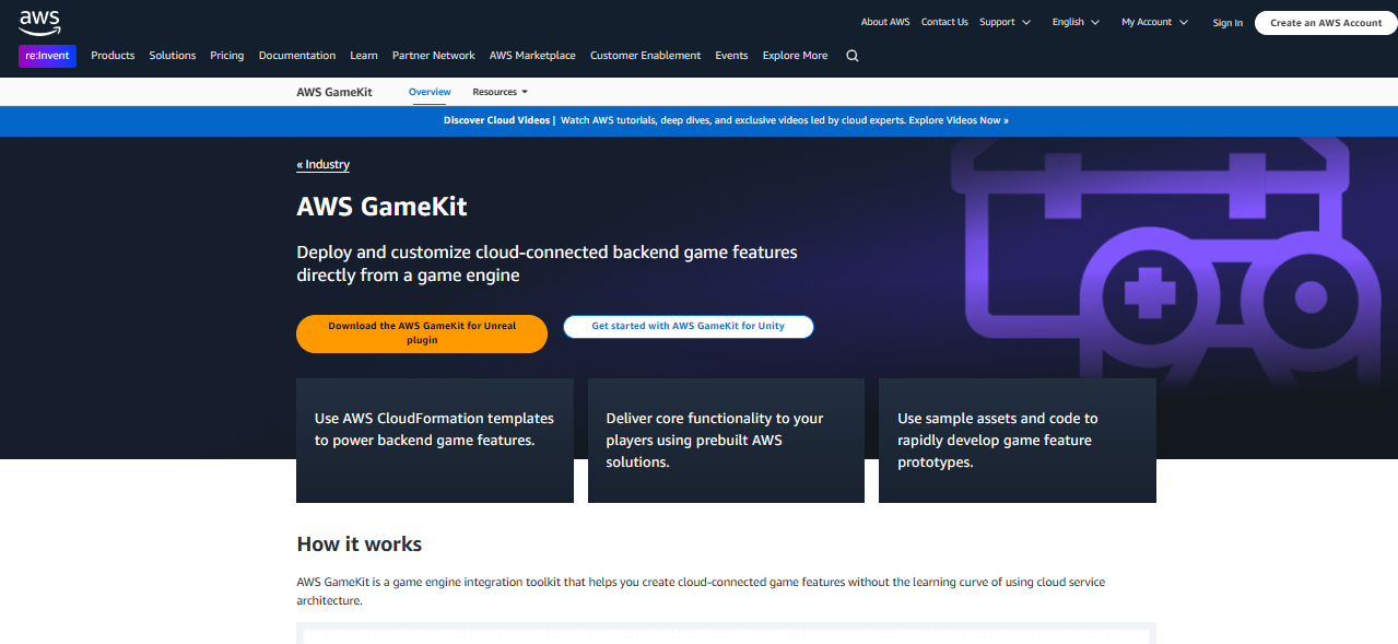 Use AWS CloudFormation templates to power backend game features. Deliver core functionality to your players using prebuilt AWS solutions. Use sample assets and code to rapidly develop game feature prototypes. AWS GameKit is a game engine integration toolkit that helps you create cloud-connected game features without the learning curve of using cloud service architecture. Quickly start prototyping active game projects with ready-to-use backend game features, open-source code, and documentation. Use solutions built by cloud architecture experts, based on the AWS Well-Architected Framework, that are secure, high-performing, and resilient. Use the AWS GameKit plugin in your game engine to configure and deploy supporting AWS resources for your cloud-based game features. Use AWS tools to monitor, scale, and customize backend services, and control your data generated and stored on AWS.