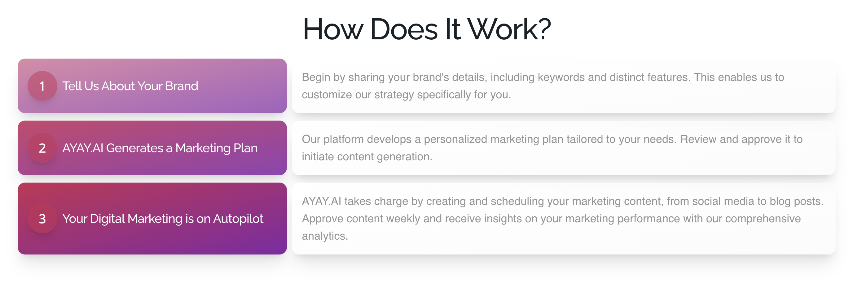 Automate content creation and schedule posts to keep your audience engaged and your brand relevant. Generate engaging social media posts tailored to your audience and brand. Effortlessly create compelling blog content with our AI writing assistant. Plan and schedule your posts to ensure consistent presence and optimal audience reach. Create trend-focused marketing content to keep your brand relevant and engaging. Monitor social media and blog performance with detailed analytics for audience insights. AYAY.AI offers a built in blog service for a smooth creation to publication experience. Manage audience interactions across all platforms with ease from a single dashboard.
